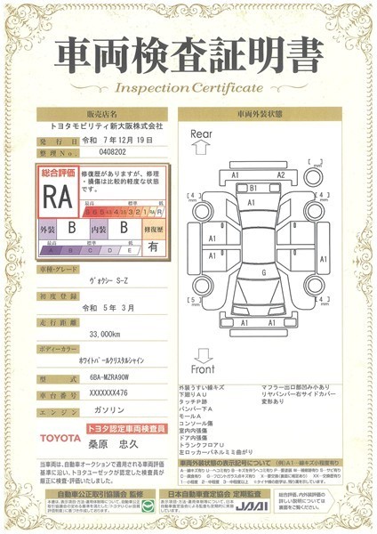 詳細及び現状の車両状態につきましては、店舗スタッフまでお尋ねください。 - 注2)上記と同様の評価点・状態表を「車両検査証明書」として店舗の展示車両に搭載しております。