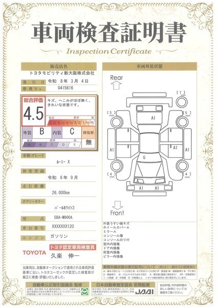 詳細及び現状の車両状態につきましては、店舗スタッフまでお尋ねください。 - 注2)上記と同様の評価点・状態表を「車両検査証明書」として店舗の展示車両に搭載しております。