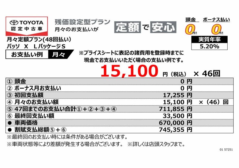 - ・支払回数48回(4年)、実質年率5.2%、割賦元金670,000円、初回支払額17,255円、最終回支払額33,500円、割賦支払総額745,355円