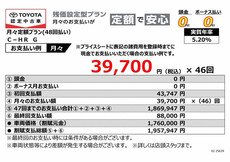 • ・支払回数48回(4年)、実質年率5.2%、割賦元金1,760,000円、初回支払額43,747円、最終回支払額88,000円、割賦支払総額1,957,947円