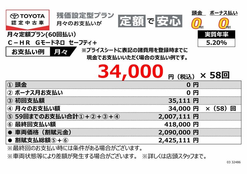 - ・支払回数60回(5年)、実質年率5.2%、割賦元金2,090,000円、初回支払額35,111円、最終回支払額418,000円、割賦支払総額2,425,111円