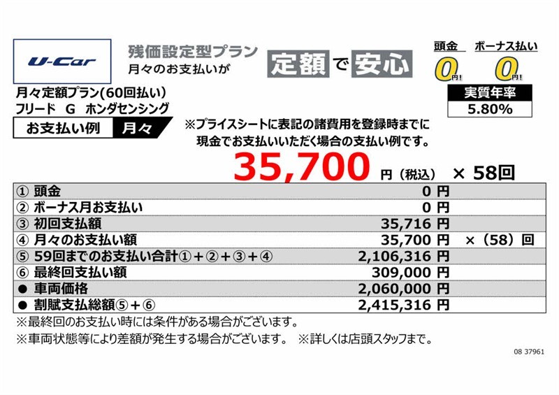 - ・支払回数60回(5年)、実質年率5.8%、割賦元金1,930,000円、初回支払額36,192円、最終回支払額289,500円、割賦支払総額2,262,892円