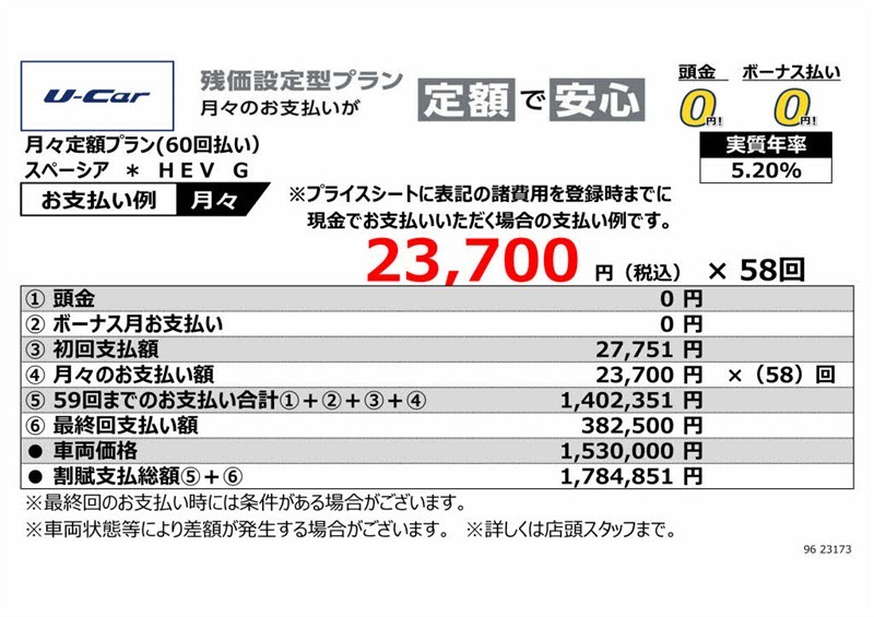 • ・支払回数60回(5年)、実質年率5.2%、割賦元金1,530,000円、初回支払額27,751円、最終回支払額382,500円、割賦支払総額1,784,851円
