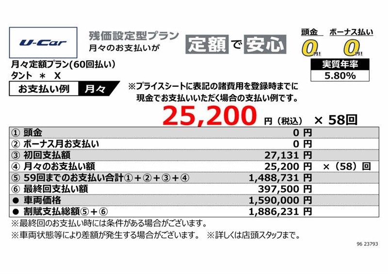 - ・支払回数60回(5年)、実質年率5.8%、割賦元金1,590,000円、初回支払額27,131円、最終回支払額397,500円、割賦支払総額1,886,231円