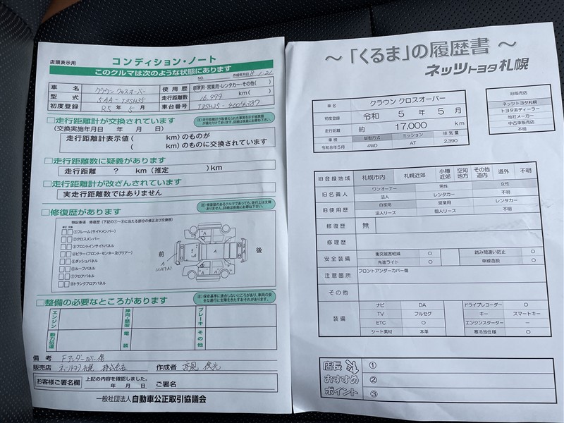 詳細及び現状の車両状態につきましては、店舗スタッフまでお尋ねください。 - 注2)上記と同様の評価点・状態表を「車両検査証明書」として店舗の展示車両に搭載しております。