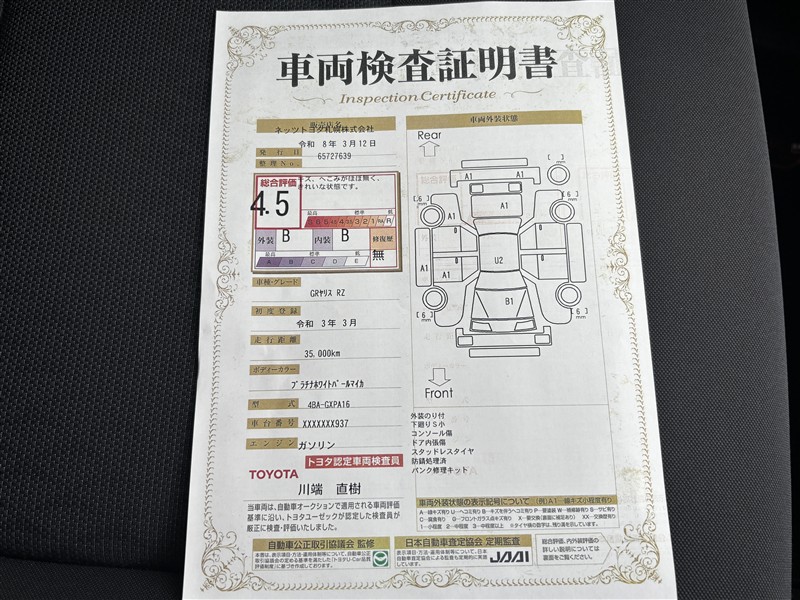 表示項目・方法・運用体制等について、自動車公正取引協議会の定める基準を満たした「トヨタU-Car品質評価制度」に基づき作成しております。