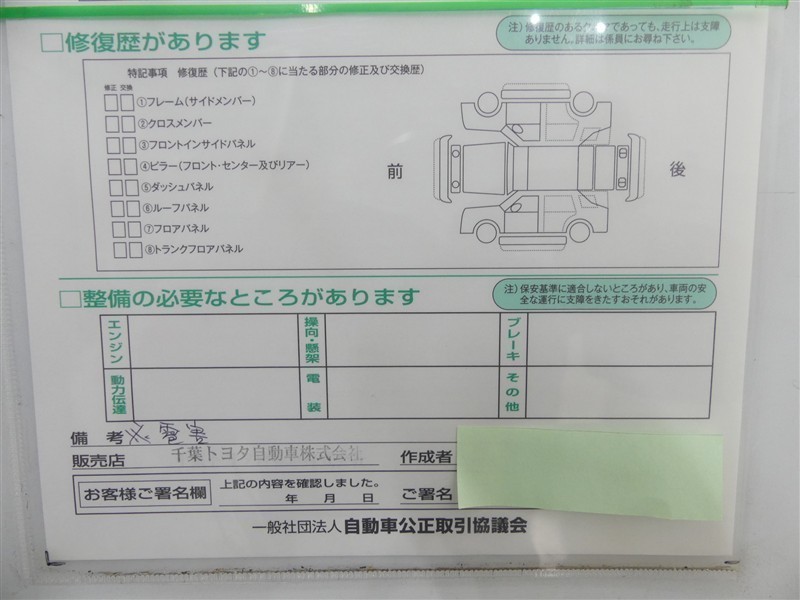 詳細及び現状の車両状態につきましては、店舗スタッフまでお尋ねください。 - 注2)上記と同様の評価点・状態表を「車両検査証明書」として店舗の展示車両に搭載しております。