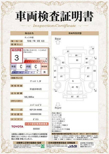 詳細及び現状の車両状態につきましては、店舗スタッフまでお尋ねください。 - 注2)上記と同様の評価点・状態表を「車両検査証明書」として店舗の展示車両に搭載しております。