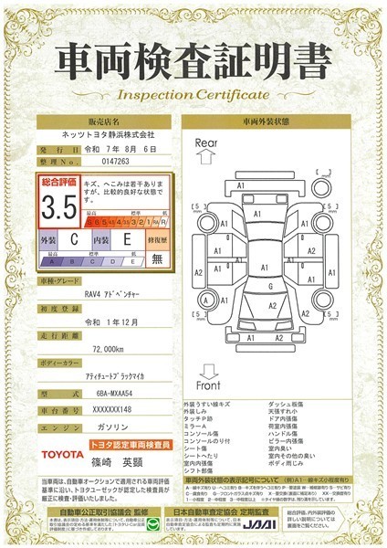 詳細及び現状の車両状態につきましては、店舗スタッフまでお尋ねください。 - 注2)上記と同様の評価点・状態表を「車両検査証明書」として店舗の展示車両に搭載しております。