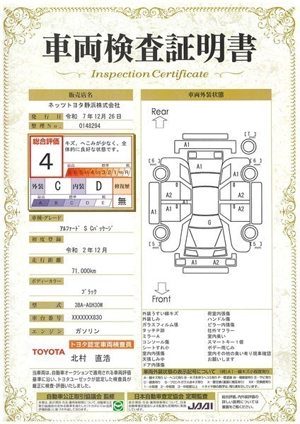 • 注1)本ページに掲載された評価は、車両検査実施時の車両状態を示したものです。