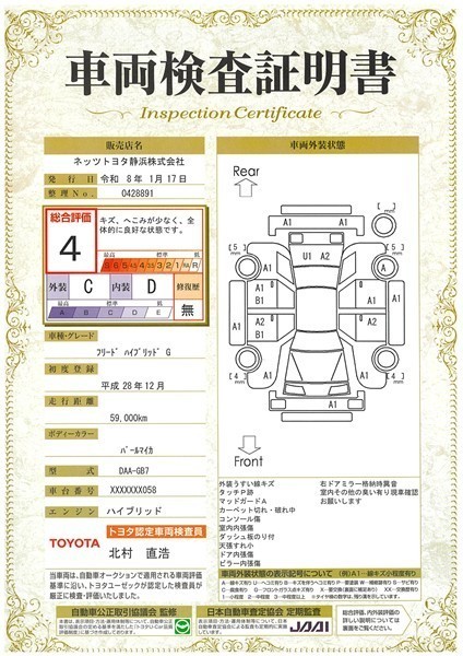 詳細及び現状の車両状態につきましては、店舗スタッフまでお尋ねください。 - 注2)上記と同様の評価点・状態表を「車両検査証明書」として店舗の展示車両に搭載しております。
