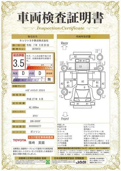 詳細及び現状の車両状態につきましては、店舗スタッフまでお尋ねください。 - 注2)上記と同様の評価点・状態表を「車両検査証明書」として店舗の展示車両に搭載しております。