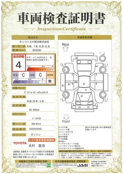 詳細及び現状の車両状態につきましては、店舗スタッフまでお尋ねください。 - 注2)上記と同様の評価点・状態表を「車両検査証明書」として店舗の展示車両に搭載しております。