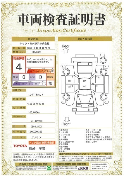 詳細及び現状の車両状態につきましては、店舗スタッフまでお尋ねください。 - 注2)上記と同様の評価点・状態表を「車両検査証明書」として店舗の展示車両に搭載しております。
