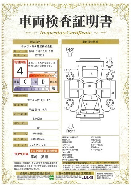 詳細及び現状の車両状態につきましては、店舗スタッフまでお尋ねください。 - 注2)上記と同様の評価点・状態表を「車両検査証明書」として店舗の展示車両に搭載しております。