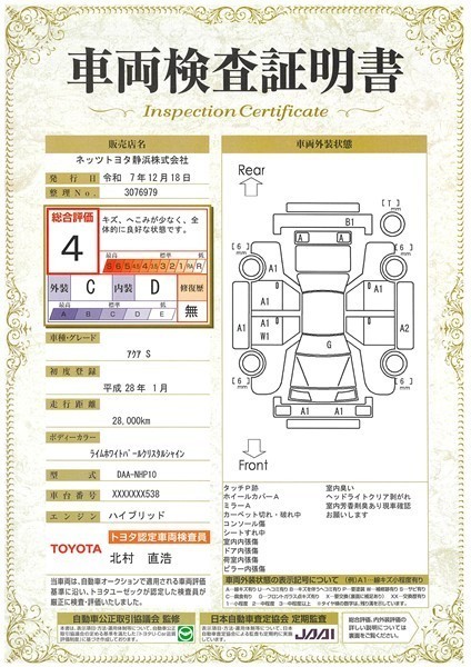 詳細及び現状の車両状態につきましては、店舗スタッフまでお尋ねください。 - 注2)上記と同様の評価点・状態表を「車両検査証明書」として店舗の展示車両に搭載しております。