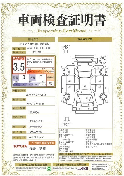 詳細及び現状の車両状態につきましては、店舗スタッフまでお尋ねください。 - 注2)上記と同様の評価点・状態表を「車両検査証明書」として店舗の展示車両に搭載しております。