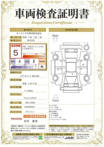 詳細及び現状の車両状態につきましては、店舗スタッフまでお尋ねください。 - 注2)上記と同様の評価点・状態表を「車両検査証明書」として店舗の展示車両に搭載しております。