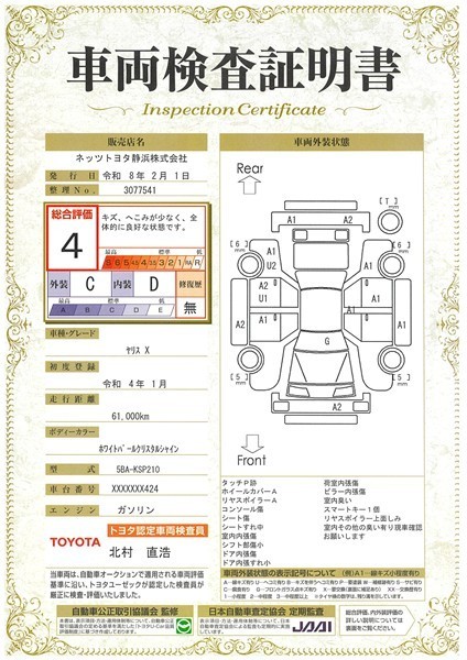 詳細及び現状の車両状態につきましては、店舗スタッフまでお尋ねください。 - 注2)上記と同様の評価点・状態表を「車両検査証明書」として店舗の展示車両に搭載しております。