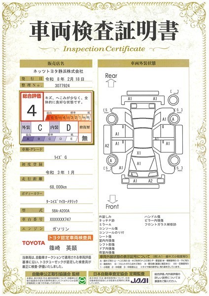 詳細及び現状の車両状態につきましては、店舗スタッフまでお尋ねください。 - 注2)上記と同様の評価点・状態表を「車両検査証明書」として店舗の展示車両に搭載しております。