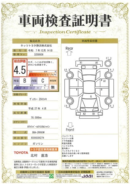 • 注1)本ページに掲載された評価は、車両検査実施時の車両状態を示したものです。
