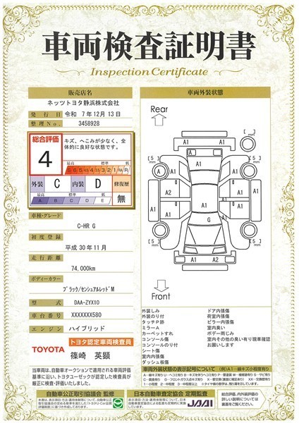 • 注2)上記と同様の評価点・状態表を「車両検査証明書」として店舗の展示車両に搭載しております。
