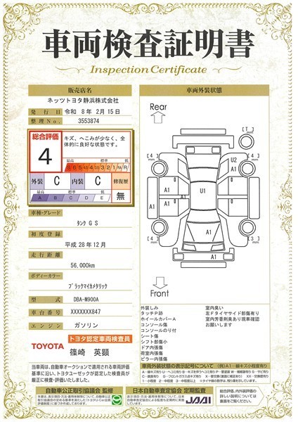 • 注2)上記と同様の評価点・状態表を「車両検査証明書」として店舗の展示車両に搭載しております。