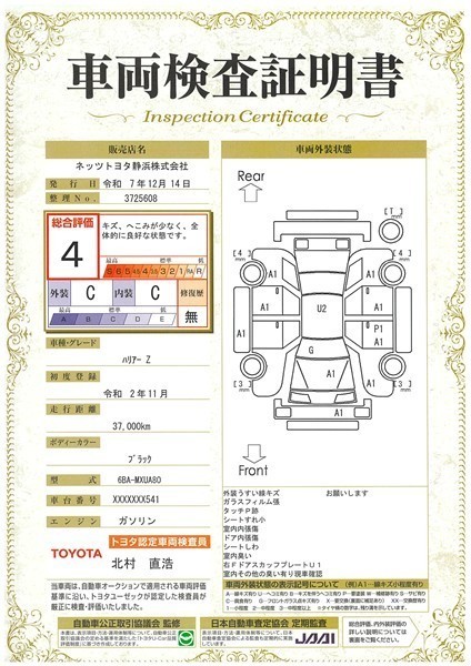 詳細及び現状の車両状態につきましては、店舗スタッフまでお尋ねください。 - 注2)上記と同様の評価点・状態表を「車両検査証明書」として店舗の展示車両に搭載しております。