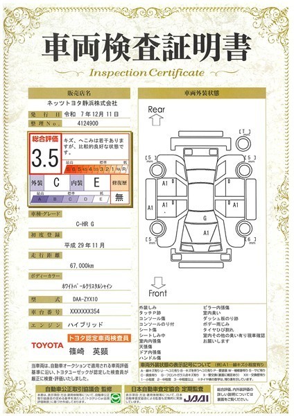 詳細及び現状の車両状態につきましては、店舗スタッフまでお尋ねください。 - 注2)上記と同様の評価点・状態表を「車両検査証明書」として店舗の展示車両に搭載しております。