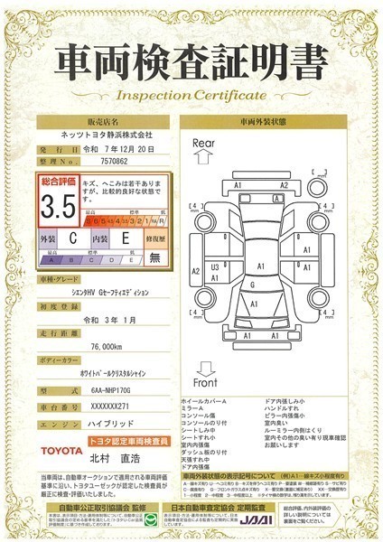 • 注1)本ページに掲載された評価は、車両検査実施時の車両状態を示したものです。