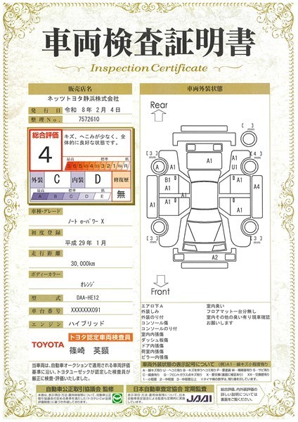 詳細及び現状の車両状態につきましては、店舗スタッフまでお尋ねください。 - 注2)上記と同様の評価点・状態表を「車両検査証明書」として店舗の展示車両に搭載しております。