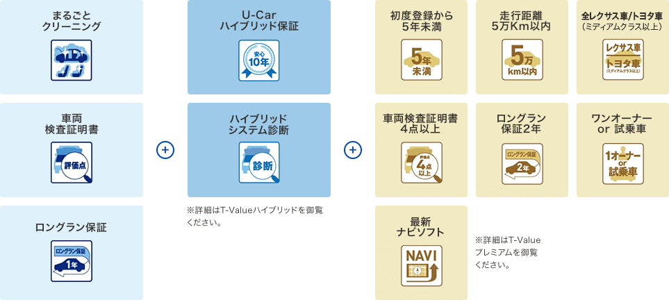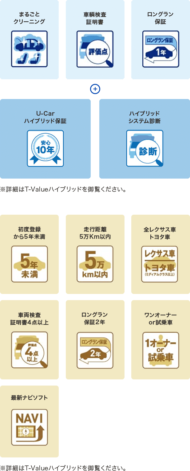 中古車ハイブリッド保証トヨタ認定中古車のハイブリッドカーは、ハイブリッド機構を無償で保証します。保証期間は、初度登録年月から10年目まで、または3年間の長い方。但し累計走行距離が20万km以内です。