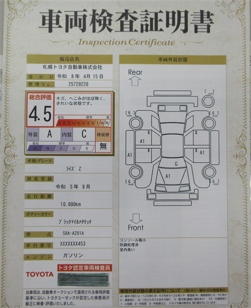 上記と同様の評価点・状態表を「車両検査証明書」として店舗の展示車両に搭載しております。
