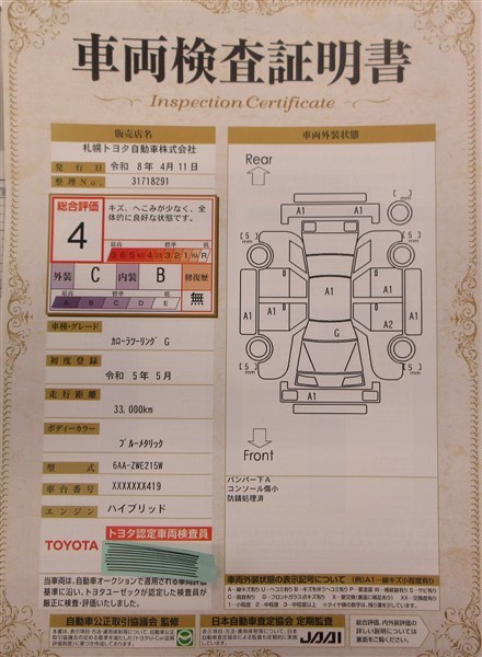 上記と同様の評価点・状態表を「車両検査証明書」として店舗の展示車両に搭載しております。