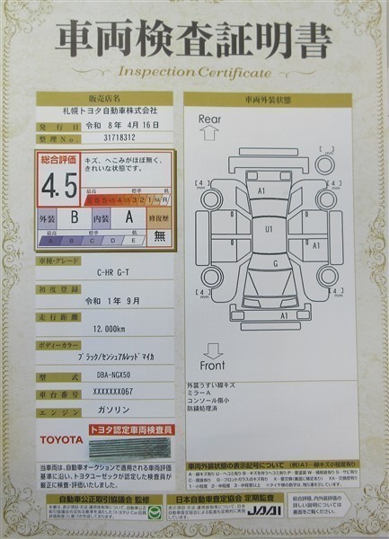 上記と同様の評価点・状態表を「車両検査証明書」として店舗の展示車両に搭載しております。