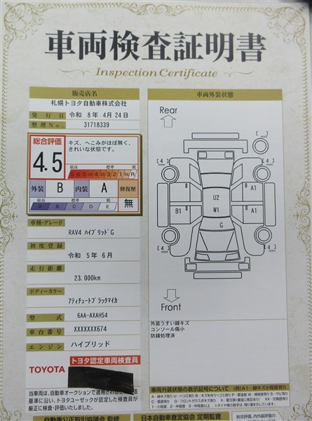 上記と同様の評価点・状態表を「車両検査証明書」として店舗の展示車両に搭載しております。