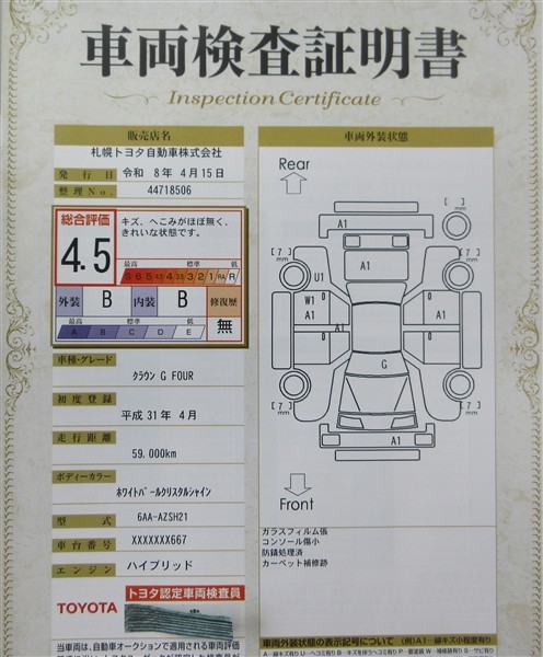 上記と同様の評価点・状態表を「車両検査証明書」として店舗の展示車両に搭載しております。