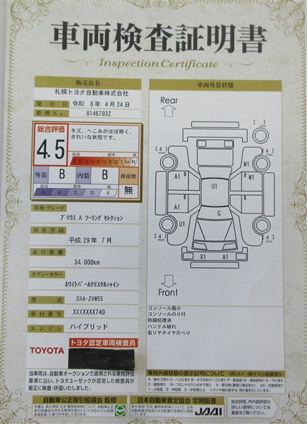 上記と同様の評価点・状態表を「車両検査証明書」として店舗の展示車両に搭載しております。
