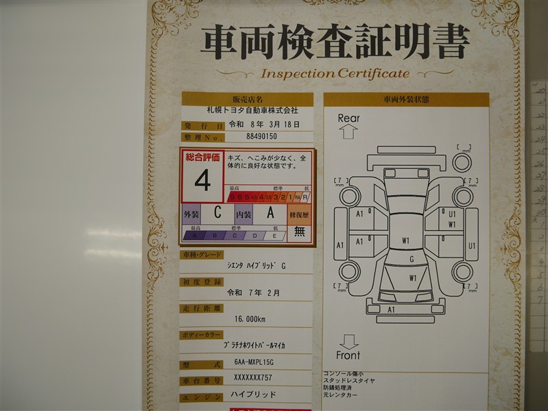 上記と同様の評価点・状態表を「車両検査証明書」として店舗の展示車両に搭載しております。