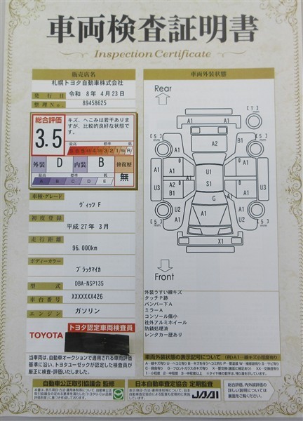 上記と同様の評価点・状態表を「車両検査証明書」として店舗の展示車両に搭載しております。