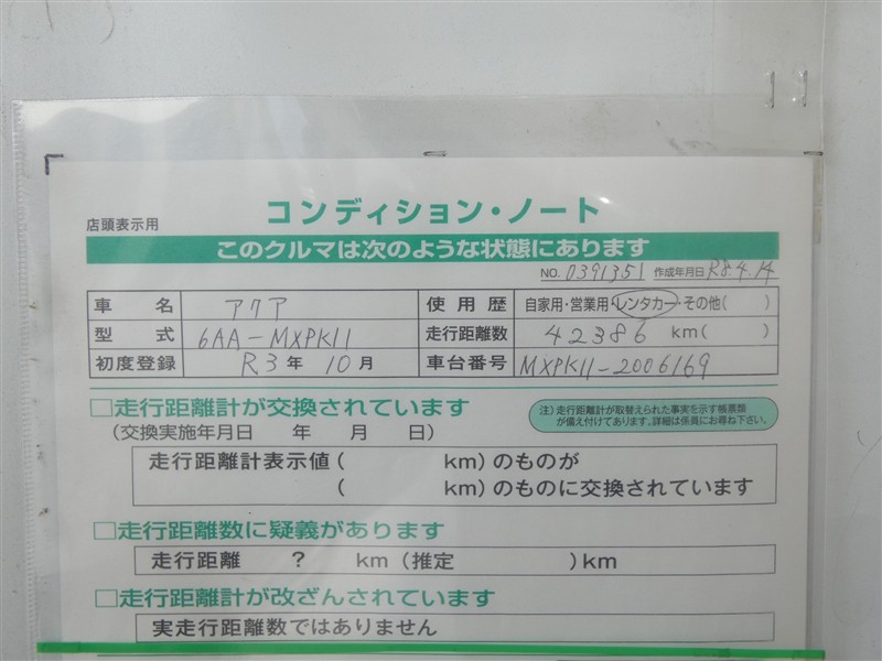 上記と同様の評価点・状態表を「車両検査証明書」として店舗の展示車両に搭載しております。