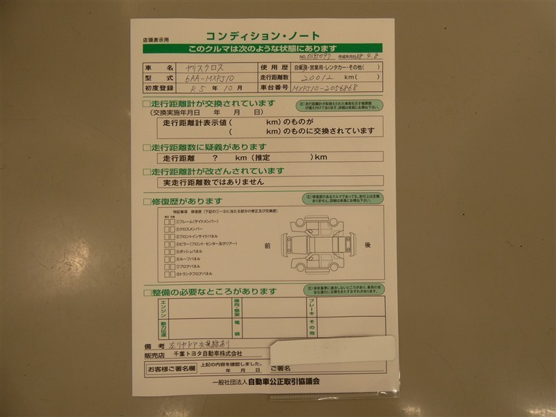 上記と同様の評価点・状態表を「車両検査証明書」として店舗の展示車両に搭載しております。
