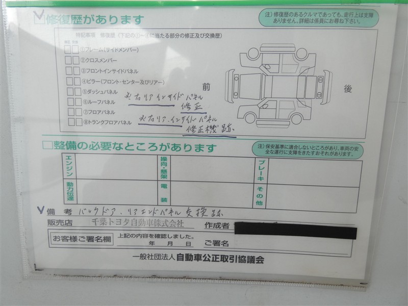 上記と同様の評価点・状態表を「車両検査証明書」として店舗の展示車両に搭載しております。