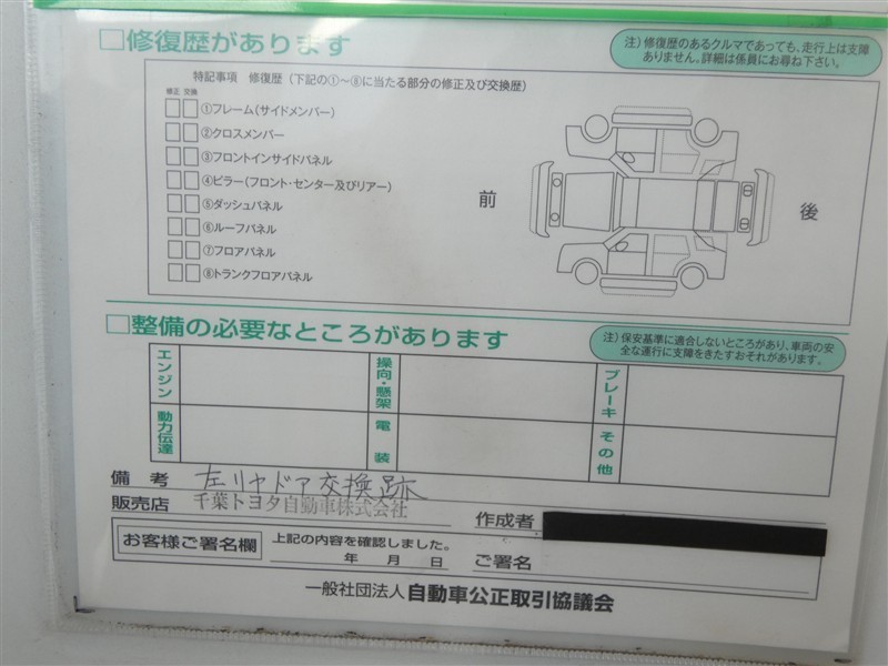 上記と同様の評価点・状態表を「車両検査証明書」として店舗の展示車両に搭載しております。