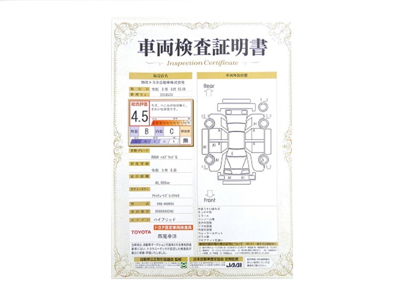 上記と同様の評価点・状態表を「車両検査証明書」として店舗の展示車両に搭載しております。