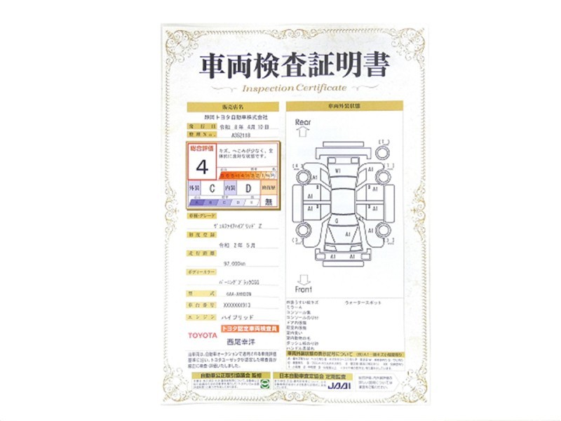 上記と同様の評価点・状態表を「車両検査証明書」として店舗の展示車両に搭載しております。