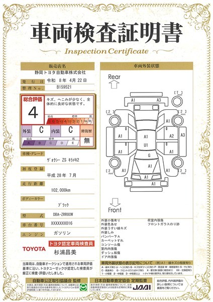 上記と同様の評価点・状態表を「車両検査証明書」として店舗の展示車両に搭載しております。