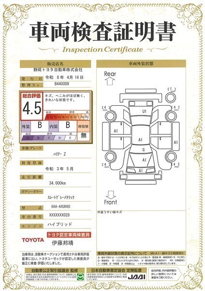 上記と同様の評価点・状態表を「車両検査証明書」として店舗の展示車両に搭載しております。