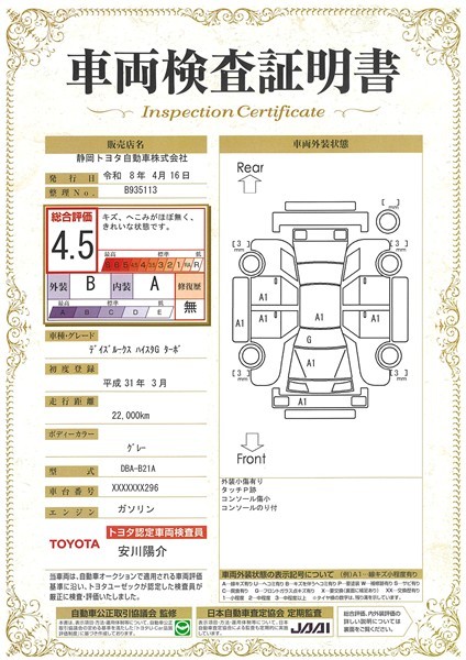 上記と同様の評価点・状態表を「車両検査証明書」として店舗の展示車両に搭載しております。