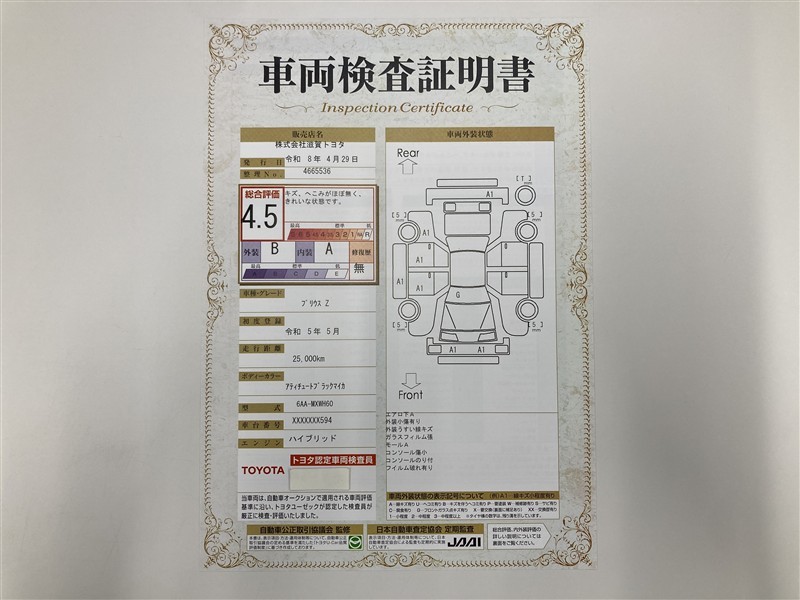 上記と同様の評価点・状態表を「車両検査証明書」として店舗の展示車両に搭載しております。